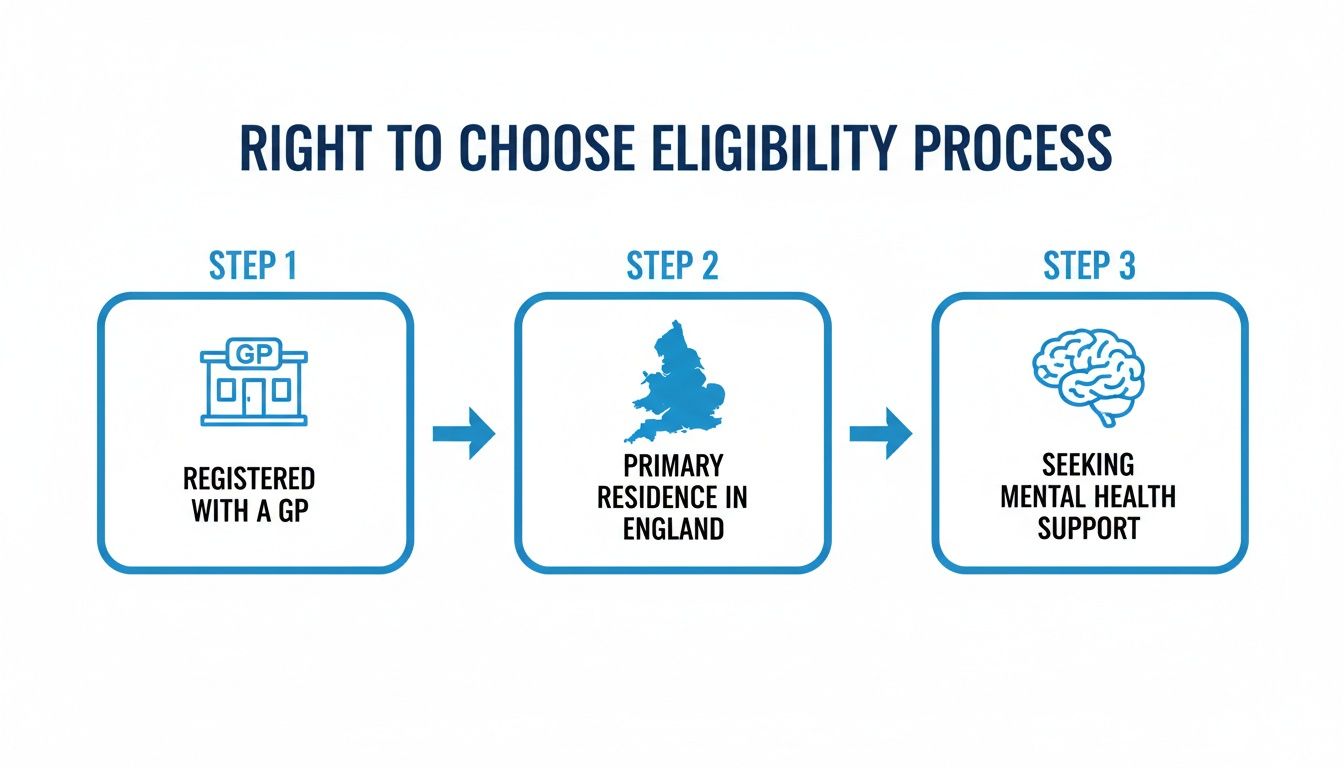 A quick but important note on location: your legal Right to Choose for mental health is specific to England. This means the scheme doesn't apply if you live and are registered with a GP in Scotland, Wales, or Northern Ireland, as they operate under different healthcare systems.
