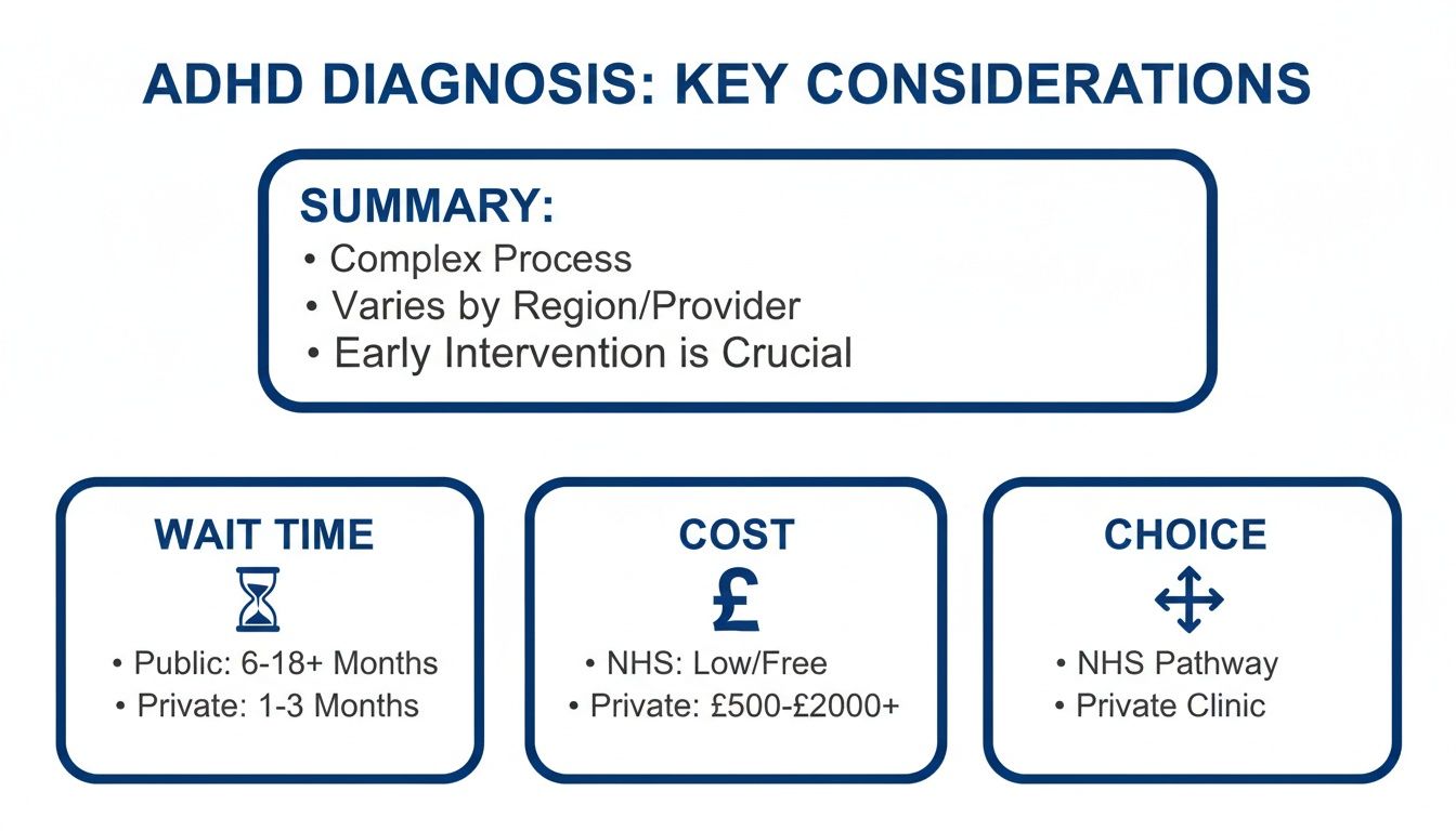Getting a private ADHD diagnosis in the UK is often the quickest way to get answers. Some clinics can offer an assessment in just a few weeks, which is a world away from NHS waiting lists that can drag on for years. This route can fast-track you to getting a specialist report, medication, and the support you need.