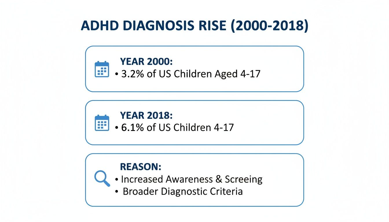 This isn't some new trend; it’s a long-overdue correction. A landmark UCL study that looked at over 7 million primary care records between 2000 and 2018 really brings this to life. It found that back in 2000, only 1.4% of boys aged 10-16 had an ADHD diagnosis. By 2018, that figure had jumped to 3.5%. The numbers for girls were much lower, starkly highlighting the diagnostic gap. It’s a clear sign that the more obvious hyperactive traits common in boys were getting picked up, while the inattentive symptoms we used to call 'ADD' were being completely overlooked.